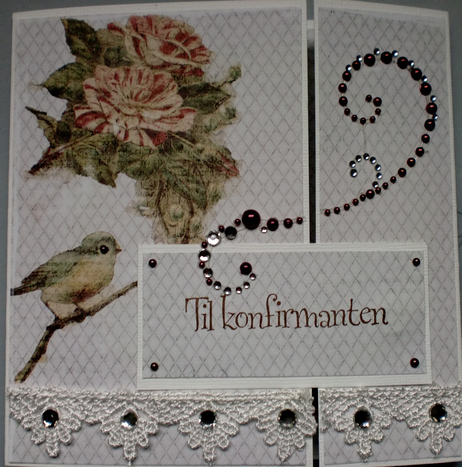 I likhet med det forrige kortet er dette laget med mønsterpapiret Beata Krem fra Kort og Godt. Nederst har jeg brukt "lace & pearl boarder" fra Prima, som jeg fikk i pakken fra Papirihjertet i dag.